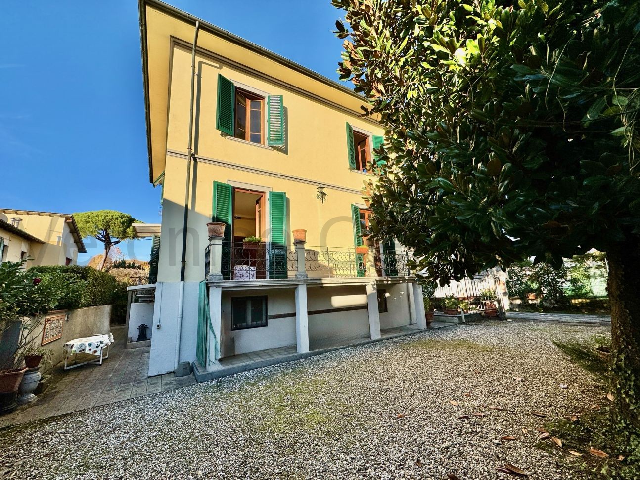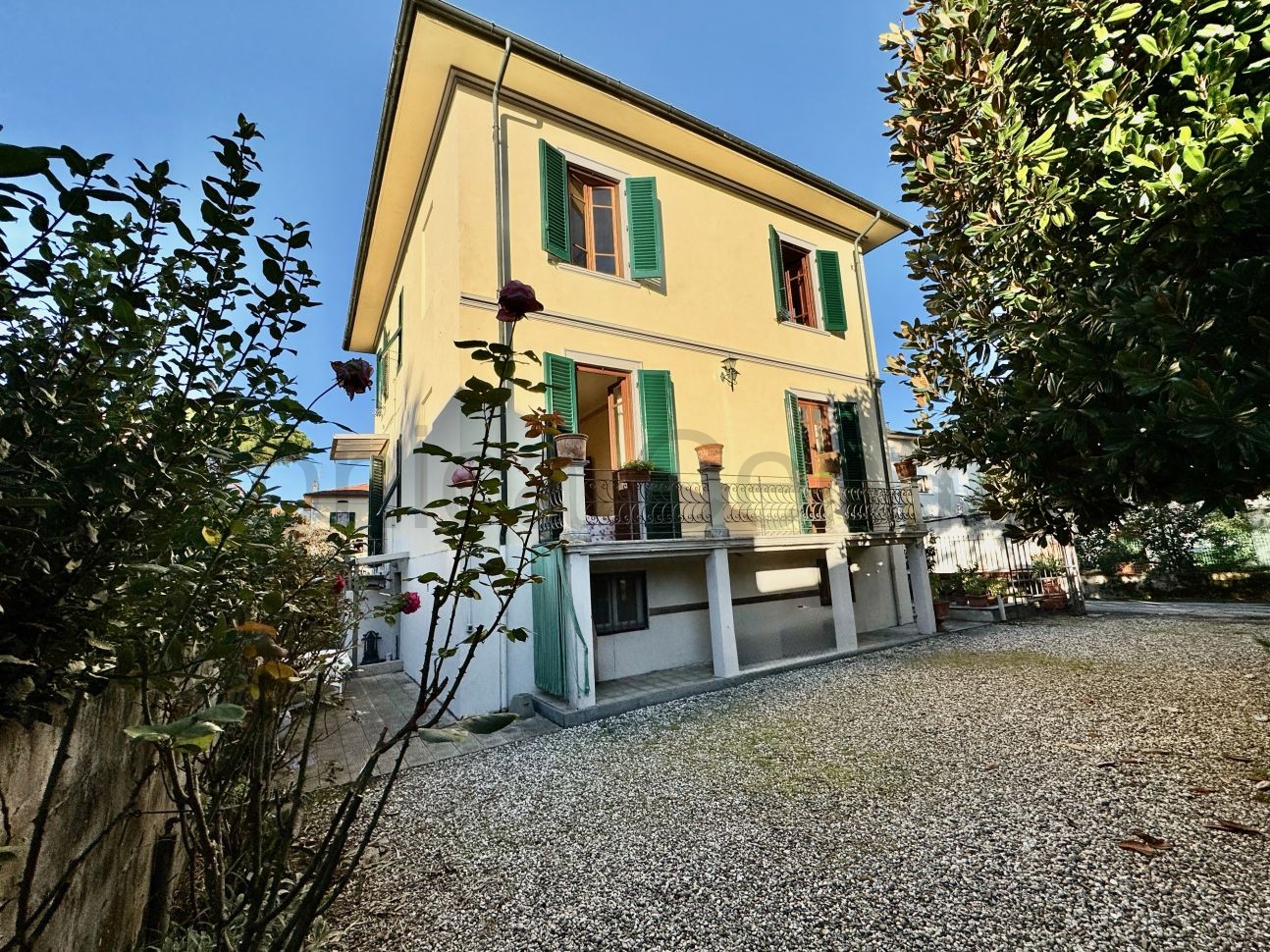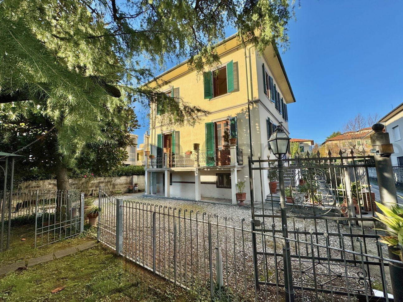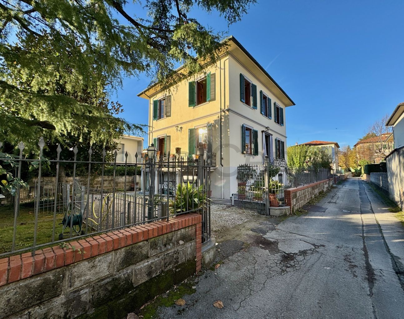 All’esterno, un curato giardino privato di circa 400 mq circonda la proprietà, arricchito da una limonaia e un garage — un’oasi verde di privacy e tranquillità a due passi dal centro.